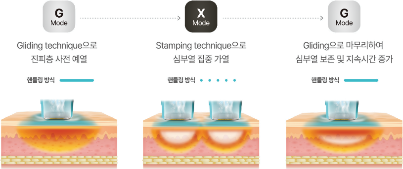 업그레이드 된 버전의 고주파 열 에너지를 이용해 피부 속 조직을 응고하는 식약처 허가 리프팅 기기이며, X모드의 강력한 심부층 가열, G모드로 진피 상부 히팅 및 심부에 열감을 한번 더 잡아주어 열 손실 없이 더 큰 효과와 긴 지속시간을 유지합니다.