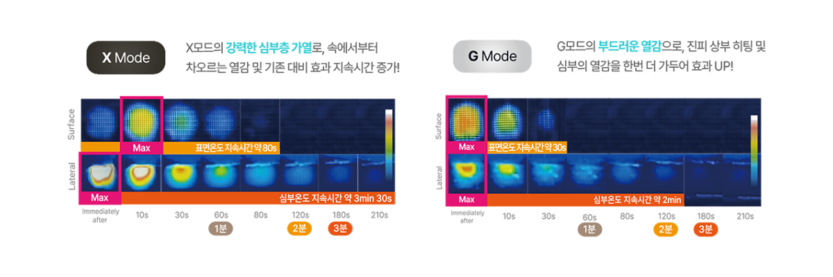 심부열 유지시간은 기존 대비 3분 30초로 늘어나 더 큰 효과와 오랜 기간 효과를 유지할 수 있으며, 쿨링 펄스 증가로 상시 쿨링 시스템을 탑재해 시술 통증을 좀 더 줄였습니다.